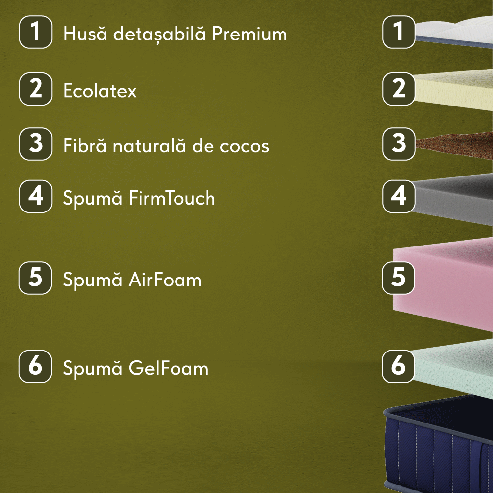 - Spumă Firm Foam, h 5 cm (densitate 32 kg/m³) - Spumă cu structură fermă, infuzată cu particule de grafit, concepută pentru a oferi un suport stabil și o circulație excelentă a aerului. Aflându-se la miezul saltelei, protejează structura de deformări.