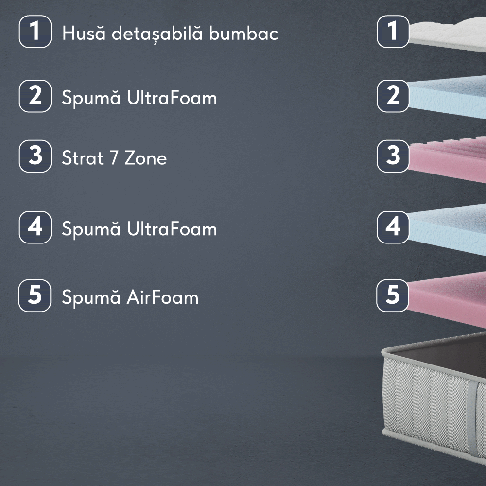 - Strat 7 Zone, h 4 cm (densitate 28 kg/m³) - Reprezintă stratul de confort al saltelei. Divizeză greutatea corpului proporțional pe saltea.