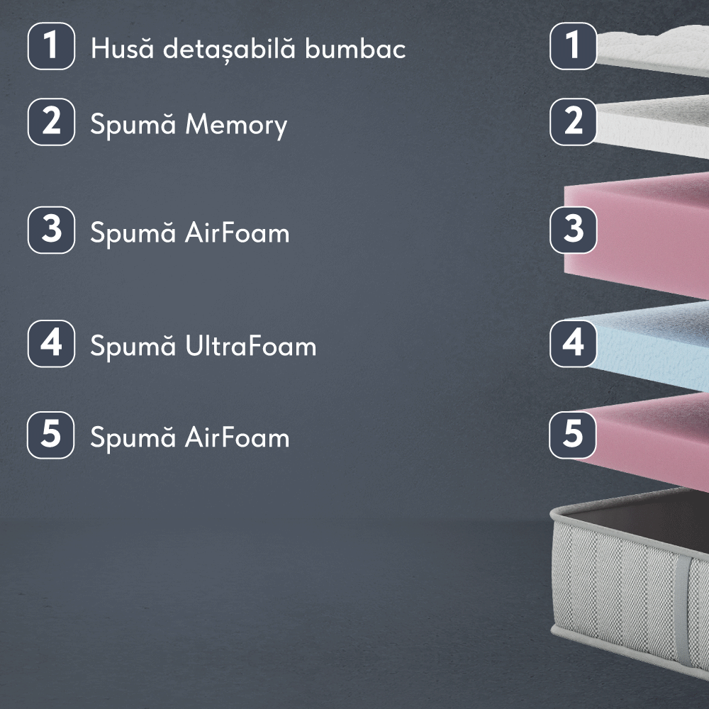 - Spumă Ultra Foam, h 5 cm (densitate 35 kg/m³) - Tranzitează adaptivitatea ce vine de sus în jos, indiferent de suprafața saltelei (cea cu spumă Memory sau cea cu spumă Air Foam).