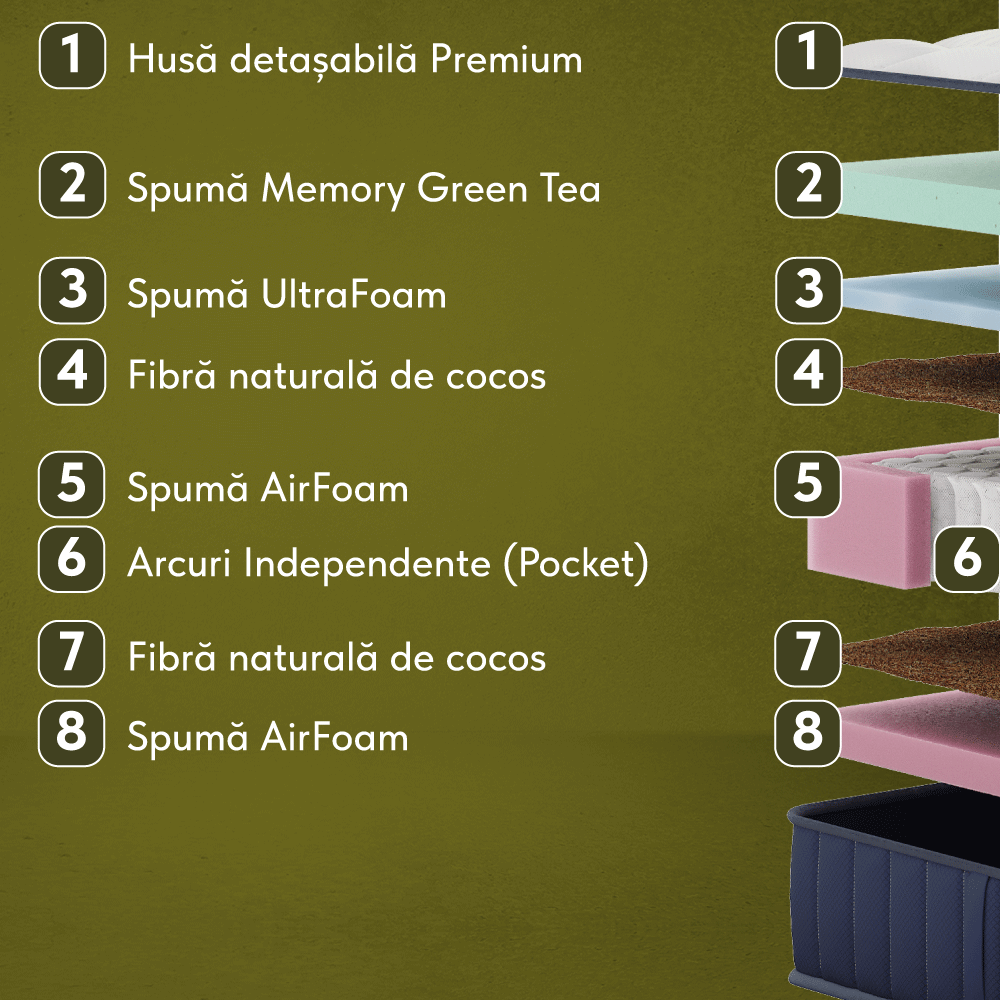 - Spumă Memory Green Tea, h 4 cm (densitate 50 kg/m³) - Strat adaptiv, ce oferă un efect de adaptivitate lent (3-5 secunde). Memory Green Tea este un tip de material infuzat cu extract de plante vegetale, astfel pe lângă faptul că oferă un confort anatomic, mai este și benefic pentru piele și respirație.