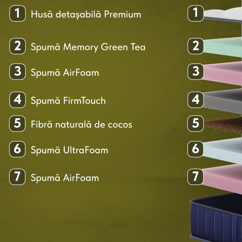 - Spumă Memory Green Tea, h 4 cm (densitate 50 kg/m³) - Strat adaptiv, ce oferă un efect de adaptivitate lent (3-5 secunde). Memory Green Tea este un tip de material infuzat cu extract de plante vegetale, astfel pe lângă faptul că oferă un confort anatomic, mai este și benefic pentru piele și respirație.