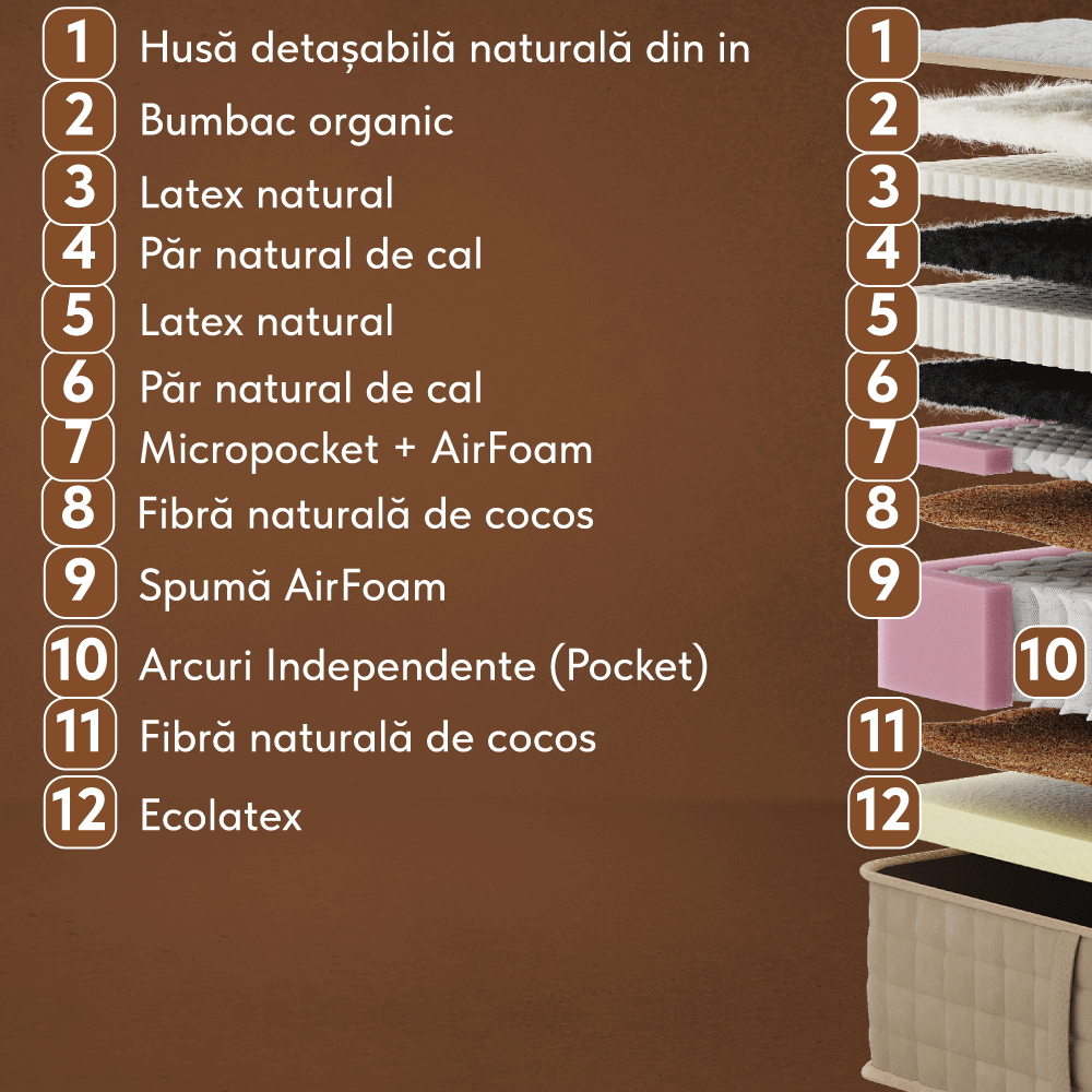 - Păr natural de Cal, h 1 cm - Divizează stratul de latex de arcurile micropocket - protejând în primul rând structura latexului. Are funcție secundară de filtrare al fluxului de aer din miezul saltelei.