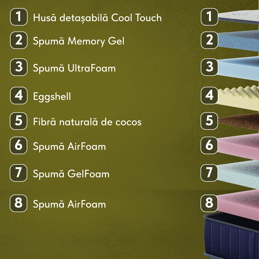 - Eggshell, h 5 cm - Strat de amortizare. Ajută la eliminarea avansată a valurilor și vibrațiilor ce vin de la suprafața saltelei. Facilitează fluxul de aer datorită formei sale.
