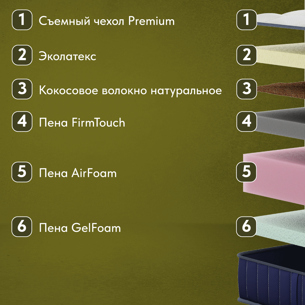 - Натуральное кокосовое волокно, h 1 см — расположено на поверхности матраса, значительно повышает жесткость.
