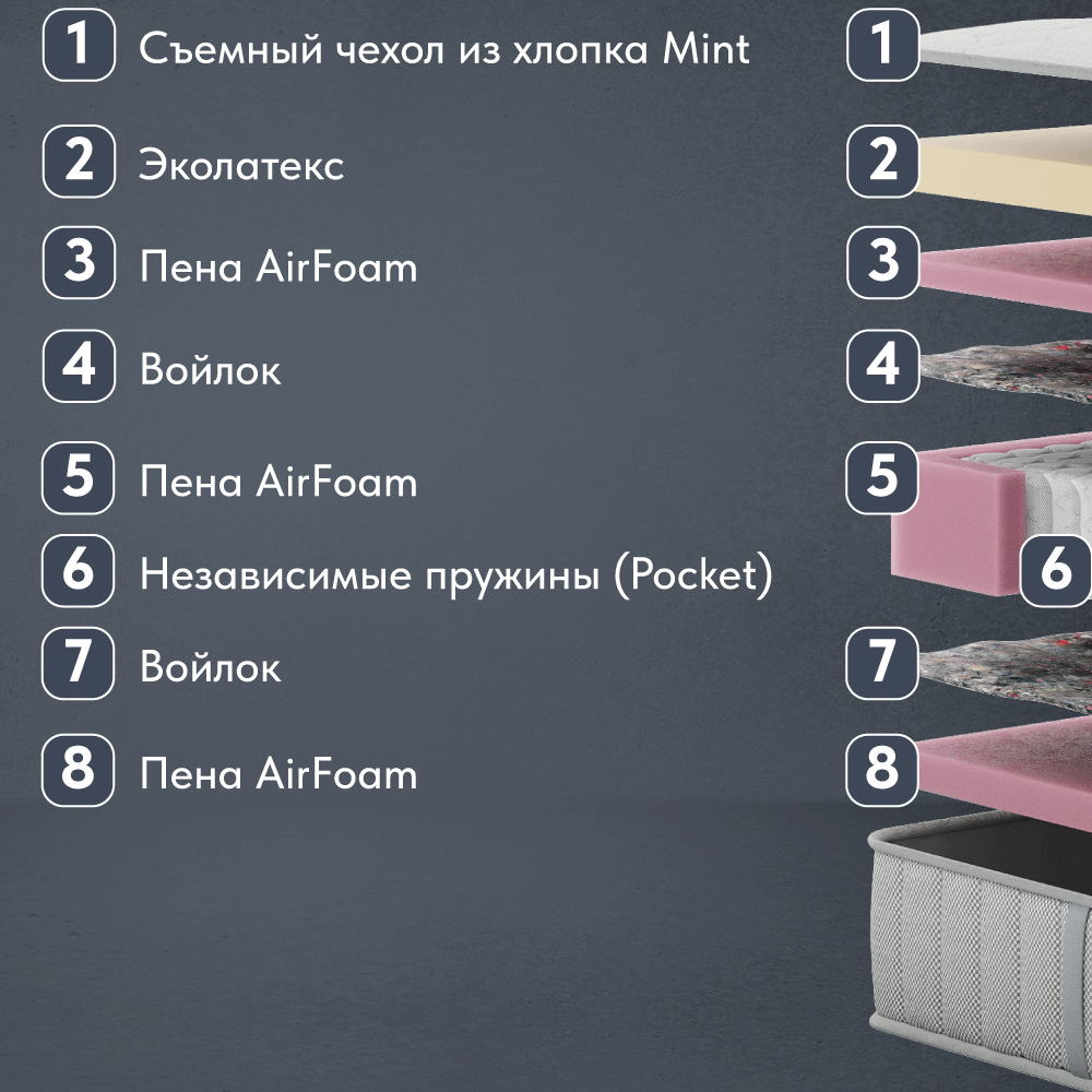 - Пена Air Foam, h 3 см (плотность 28 кг/м³) - Обеспечивает повышенную жесткость второй стороны матраса.