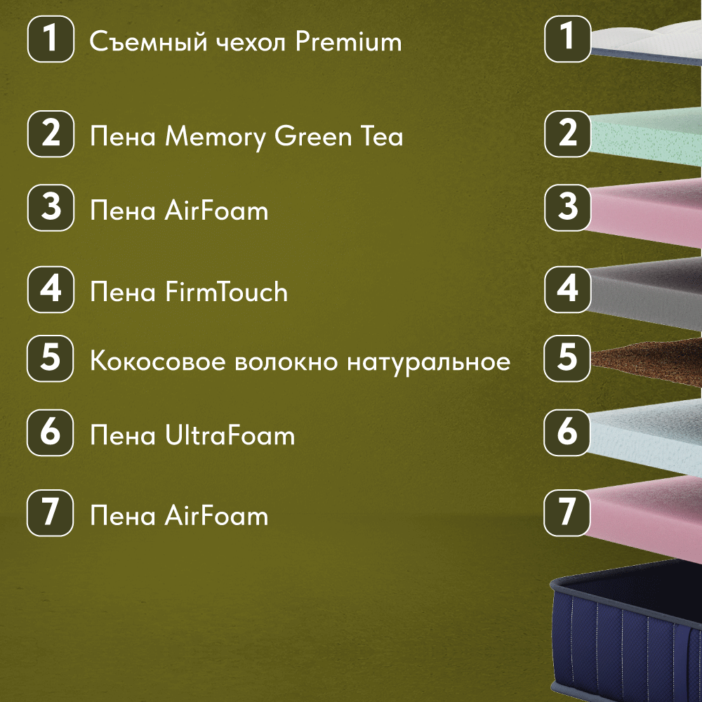 - Пена Memory Green Tea, h 4 см (плотность 50 кг/м³) - Адаптивный слой, создающий эффект медленной адаптивности (3-5 секунд). Memory Green Tea - это материал, пропитанный экстрактом растений, поэтому он не только обеспечивает анатомический комфорт, но и благотворно влияет на кожу и дыхание.