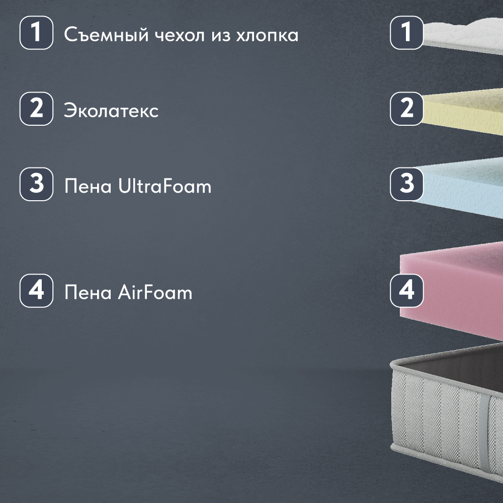 - Пена Air Foam, h 10 см (плотность 28 кг/м³) - Жесткая основа матраса. Обеспечивает вторую сторону матраса с повышенной жесткостью.